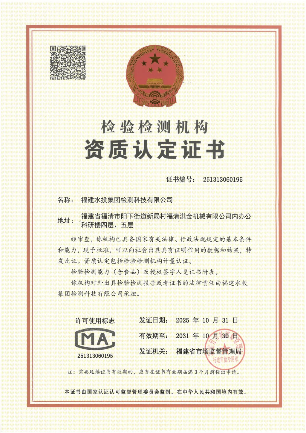 近日,福建水投集團檢測科技有限公司順利通過水質指標檢測能力CMA資質認證,涵蓋生活飲用水、水和廢水2大類74個項目,...